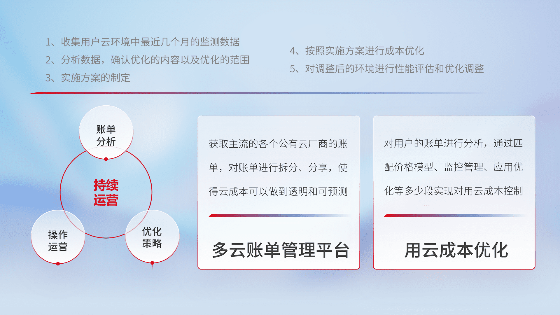通过多云纳管,,,以统一的资源数据模型把客户的云资源进行抽象和封装,,,进而实现对多云资源的统一操作,,保障云资源管理的可靠性、、、稳定性与可用性。。量身定制化运维内容,,,配置、、、开发运维、、、、补丁管理、、、、备份、、监控、、认证和访问管理、、审计和日常巡检等,,,,保障在用云过程中的可靠度,,稳定度以及高可用率。。